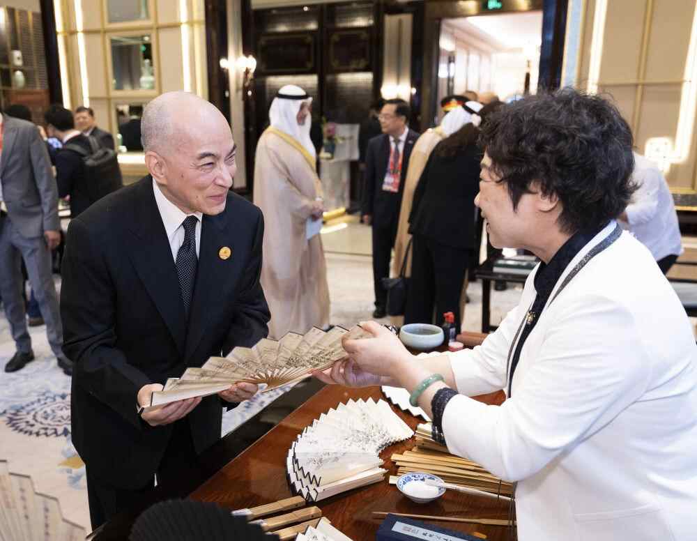 这是柬埔寨国王西哈莫尼欣赏非遗展示。