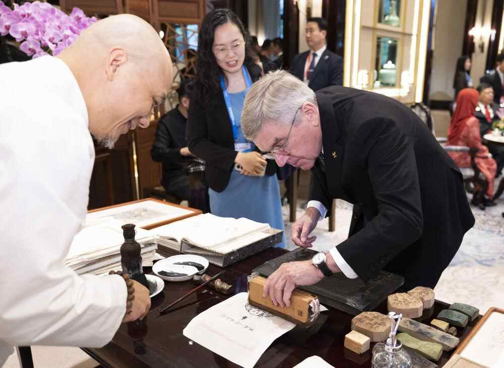 这是亚奥理事会代理主席辛格和夫人维尼塔、国际奥委会主席巴赫欣赏非遗展示。
