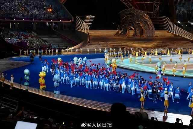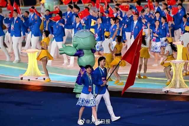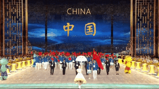 东道主中国代表团入场,游泳运动员覃海洋、篮球运动员杨力维担任旗手。中国代表团由1329人组成,其中运动员886人。中国代表团将参加38个大项、407个小项的比赛。