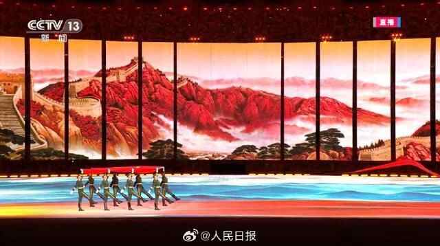 中华人民共和国国旗庄严入场,舞台中央地屏绚丽“中国红”托起水光蓝千里江山,背景万里长城蜿蜒于群山之中。绿水青山不老,孩子们纯真的歌声唱响《我爱你中国》,合唱团让爱国最强音深入人心。
