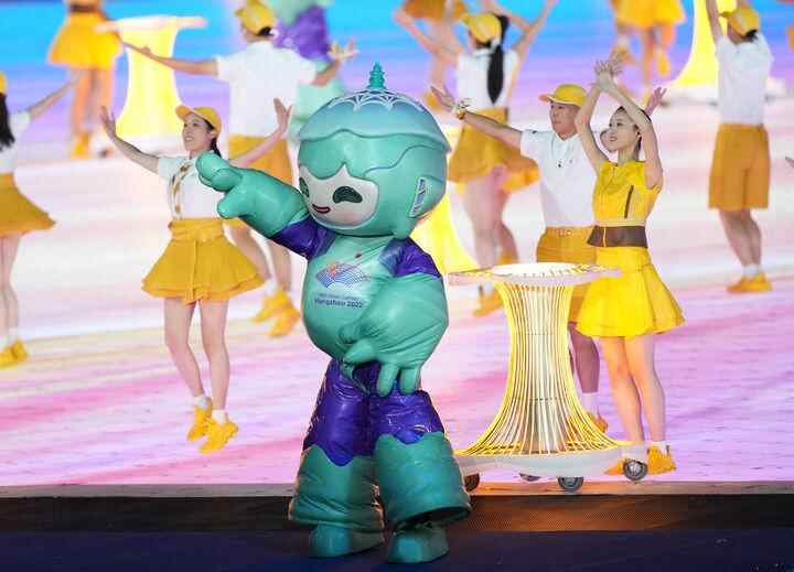 9月23日,杭州亚运会吉祥物莲莲在开幕式上欢迎运动员。新华社记者 孟永民 摄