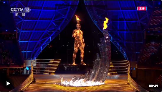 在杭州亚运会开幕式现场,由数字火炬手组成的数字人与现场最后一棒火炬手,共同采用甲醇燃料点燃杭州亚运会主火炬塔。这是人类历史上第一次碳废再生、零碳甲醇点燃亚运圣火。