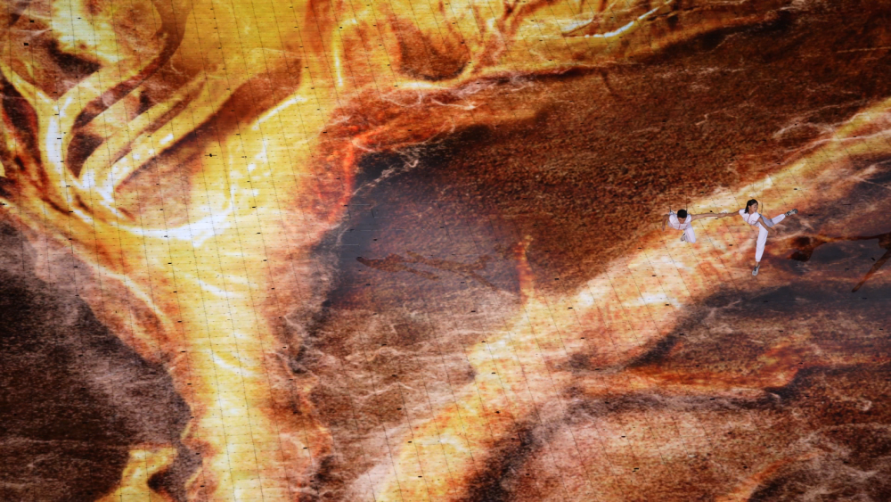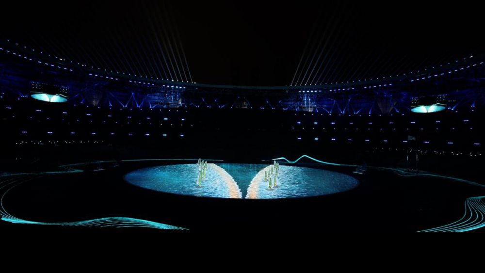 首次将3D双威亚技术应用于大型运动场中,立体飞旋于空中的男女演员与潮共舞,与地屏中的浪潮即时互动,这是人与自然的和谐共生。浪潮运动轨迹与演员动作伴随着音乐节奏紧密配合,带给观众视听震撼。