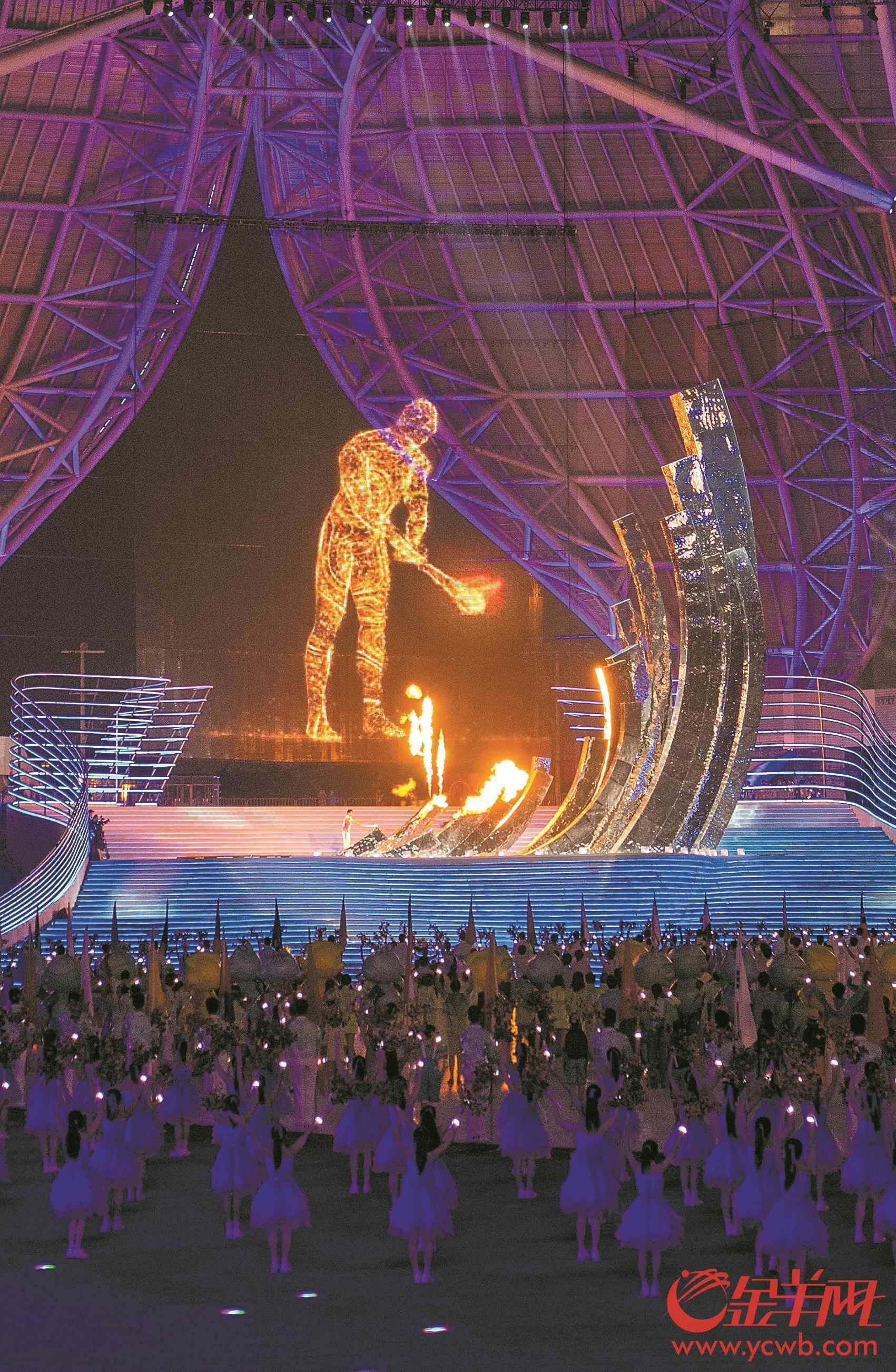 承载着全世界亿万人热情的“数字火炬手”跨越壮阔的钱塘江,来到杭州奥体中心体育场上空,奔向主火炬塔。19根机械柱缓缓立起,每一根代表一届亚运会。点火前呈卷曲状,高约9米,好像一朵翻卷的浪花,又似中国传统文化中的“祥云”;展开后高19米,亚运圣火在19个柱头一路燃起,如“壮观天下无”的钱江大潮奔涌,一浪高过一浪,最终腾跃在最高的火炬柱头。“数字火炬手”与现场最后一棒火炬手汪顺共同点燃主火炬塔。亚运史上首个“数实融合”点火仪式带给观众全新的体验。