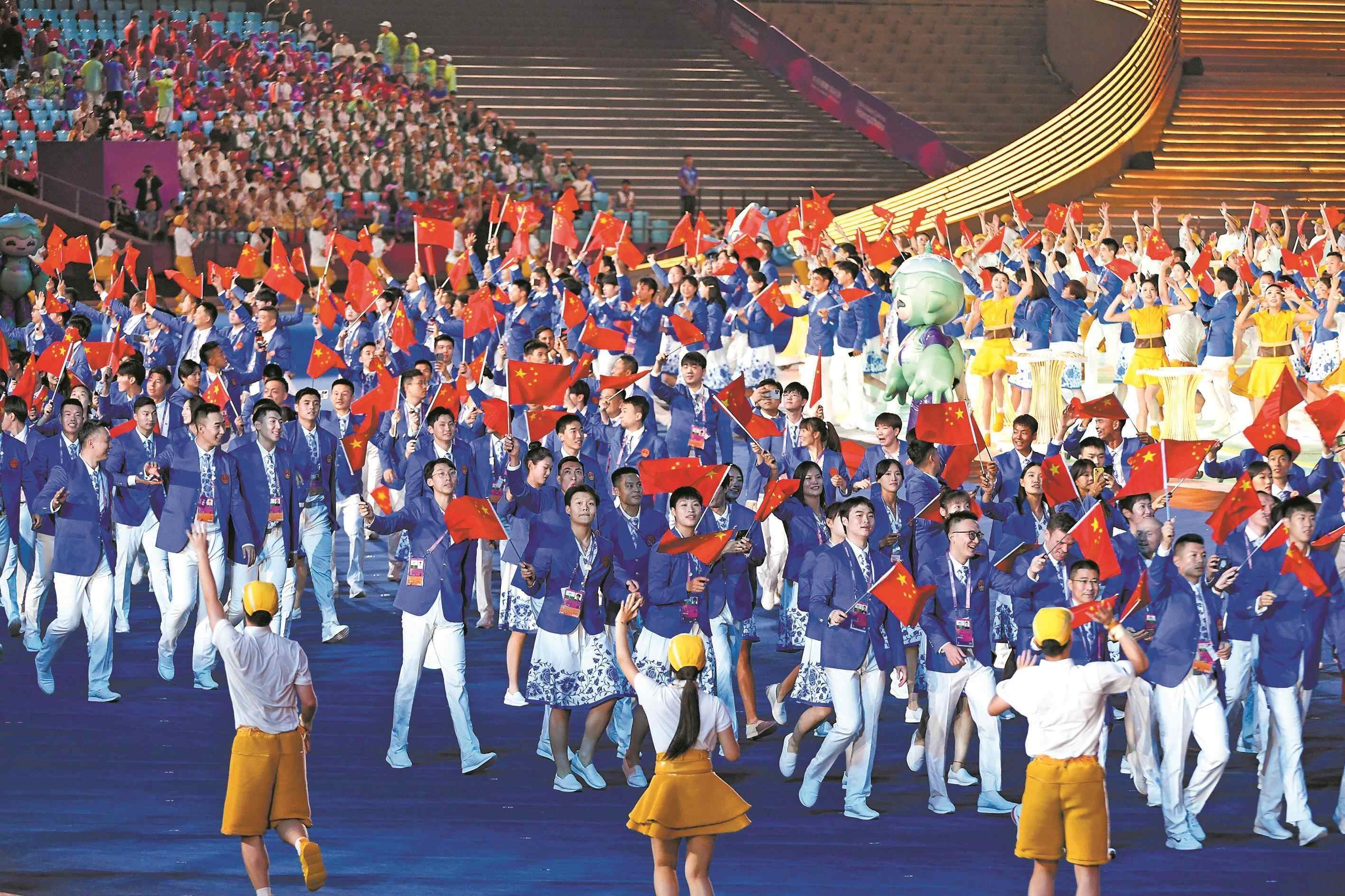 运动员入场式上,东道主中国代表团最后出场。在《歌唱祖国》的激昂旋律中,中国体育代表团身着蓝白色“星耀”礼服亮相,覃海洋和杨力维共同举旗走在队伍前方。观众席上,掌声欢呼声此起彼伏。