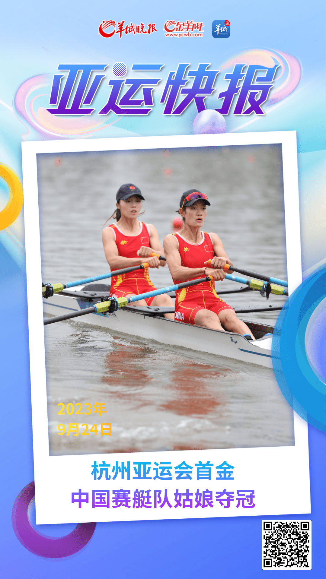 9月24日,杭州第19届亚运会,赛艇女子轻量级双人双桨决赛,中国组合邹佳琪/邱秀萍夺得金牌,这是本届亚运会产生的首枚金牌,也是中国代表团获得的首枚金牌。
