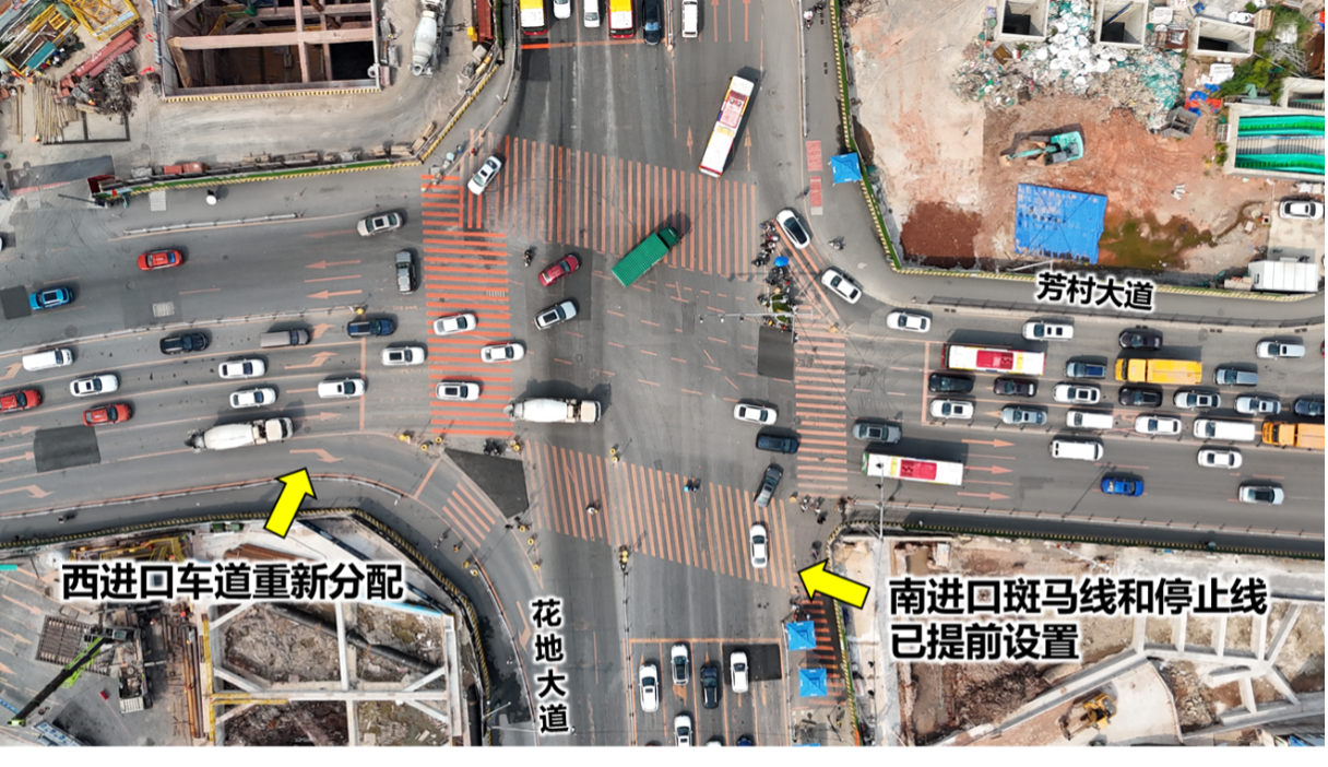 针对花地大道与芳村大道交叉口排队过长问题,荔湾区通过调整芳村大道西进口车道分配,增加一条直行车道及一条右转专用道,进一步增大西进口的排队蓄车空间;将花地大道南进口斑马线和停止线提前,增大南进口的排队蓄车空间。