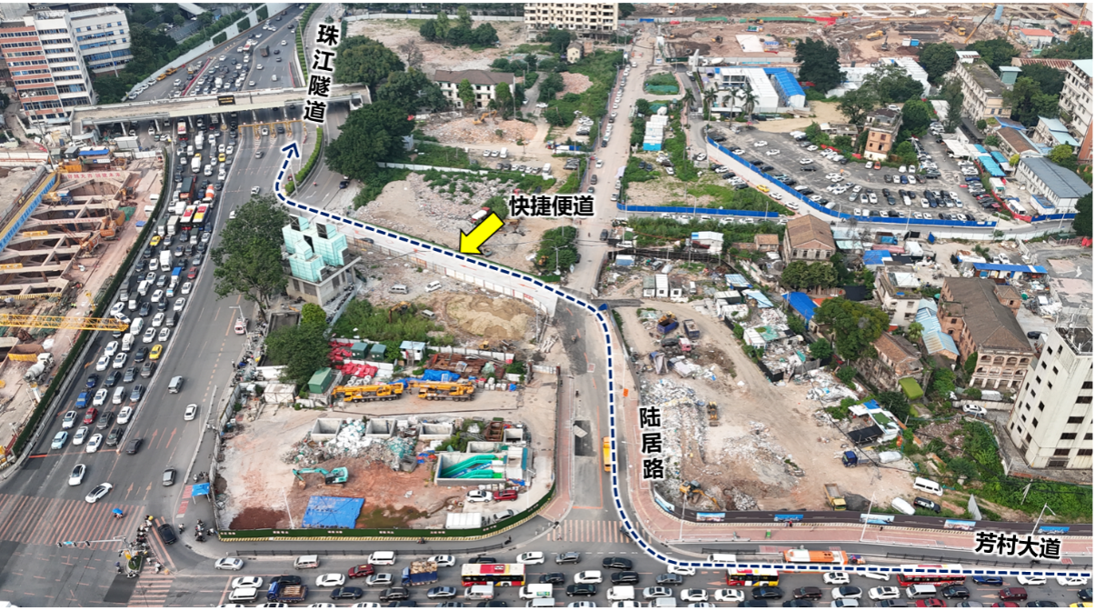 另一方面,针对芳村大道东进口右转往珠江隧道的车流量大,右转车辆占用直行车道等问题,通过打通连接陆居路、明心路、珠江隧道和上涌直街的快捷通道(便道),接顺内部道路,形成交通微循环,东进口右转车辆可提前沿陆居路、明心路进入珠江隧道和上涌直街,进一步释放东进口的直行车道空间。