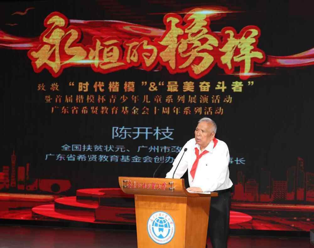 广州市政协原主席、广东省希贤教育基金会创办人名誉理事长陈开枝表示,“时代楷模”和“最美奋斗者”,涵盖了各行各业在革命和建设中做出杰出贡献的个人和群体,他们是中华民族崛起的中坚力量,代表了时代的精神、民族的精神,是中华民族的“根”与“魂”,更是青少年品德教育的鲜活样本,希望通过“楷模杯”让更多的校园学子感受楷模和英雄们的精神光芒。