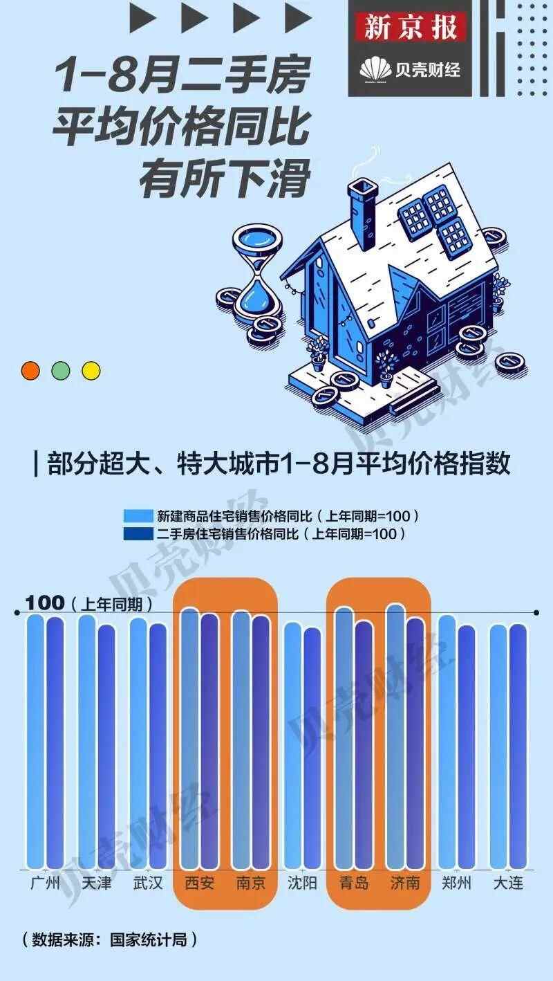 据新京报贝壳财经记者不完全统计,截至9月20日,已有17城取消或松绑住房限购政策。9月这波楼市松绑热潮中,除了像关注广州这样的一线城市,还有像武汉、西安等特大城市。从已调整限购政策的特大及以上城市房价来看,今年1-8月平均二手房价格均相比去年同期有所下滑,仅西安、南京、青岛、济南4地新建商品住宅销售平均价格相比同期有所上浮。