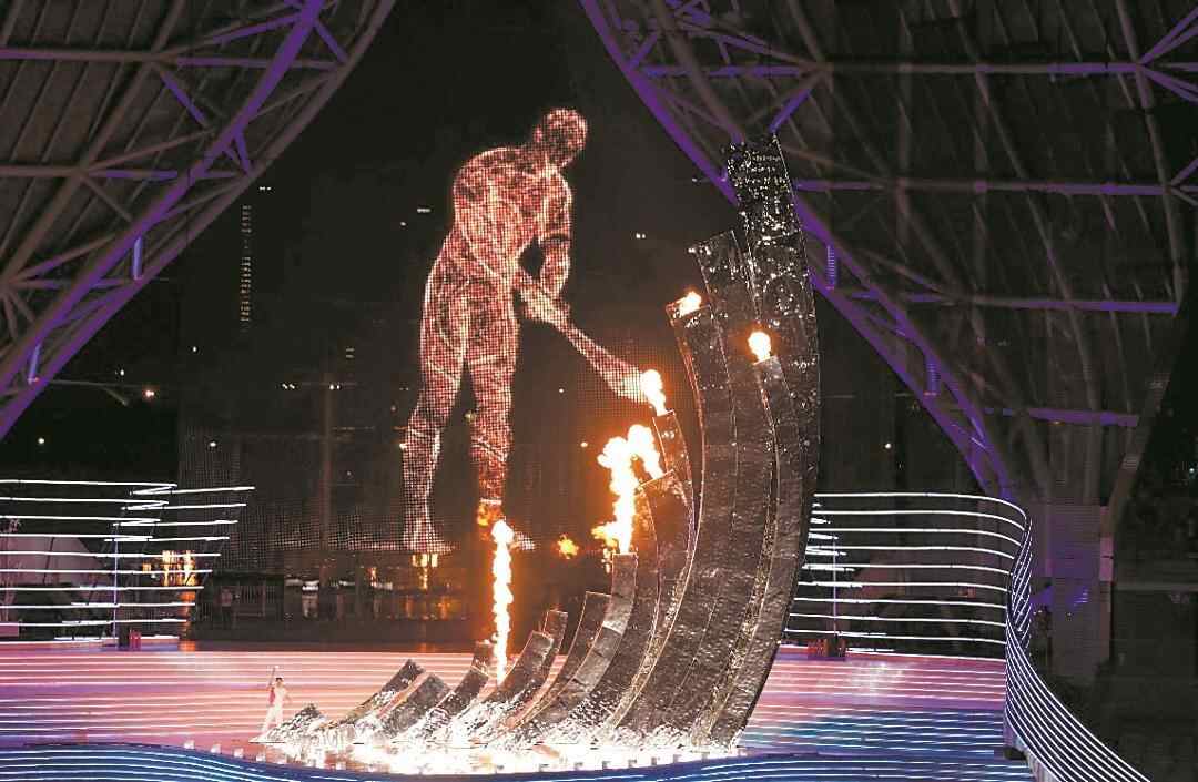 杭州亚运会开幕式上,象征着超过1亿名“数字火炬手”的金色数字人手持火炬,跑过会场,与主火炬手一起点燃主火炬塔。