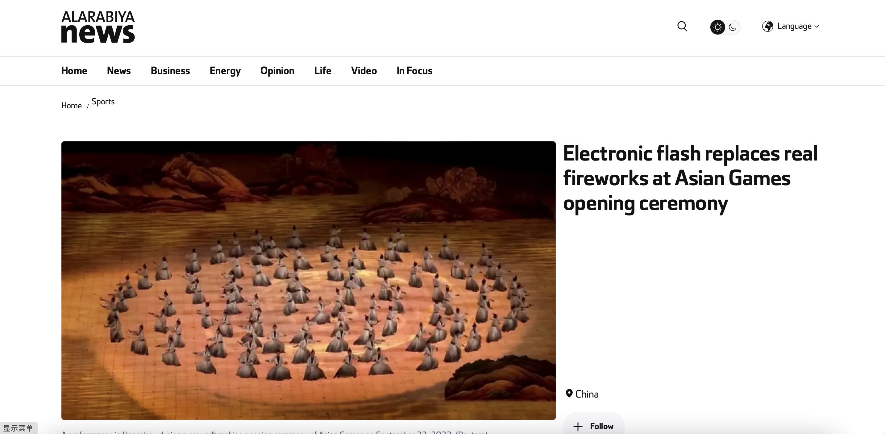 9月23日晚,第十九届亚洲运动会在中国浙江省杭州市拉开帷幕。当晚开始,中东各大媒体就频繁聚焦开幕盛况,第一时间播发报道。
