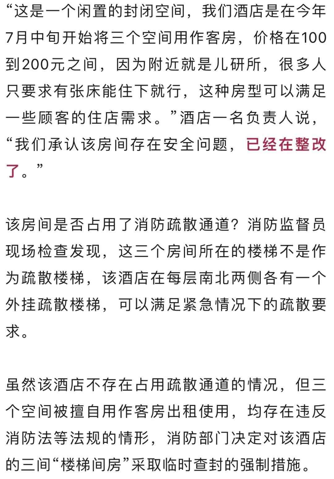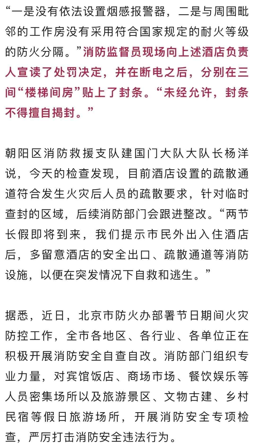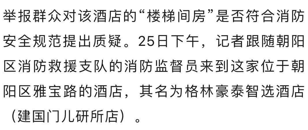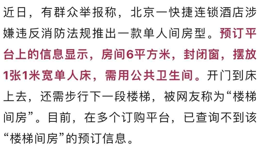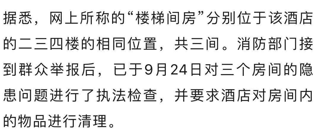 近日,有媒体报道,国庆期间北京一快捷连锁酒店推出“楼梯间房”,该房间是否符合消防安全规范?北京市朝阳区消防救援支队检查发现,该酒店改造的三间“楼梯间房”均存在未设置烟感报警器和防火分隔等级不达标等问题,9月25日下午,执法人员对上述客房采取了临时查封强制措施。