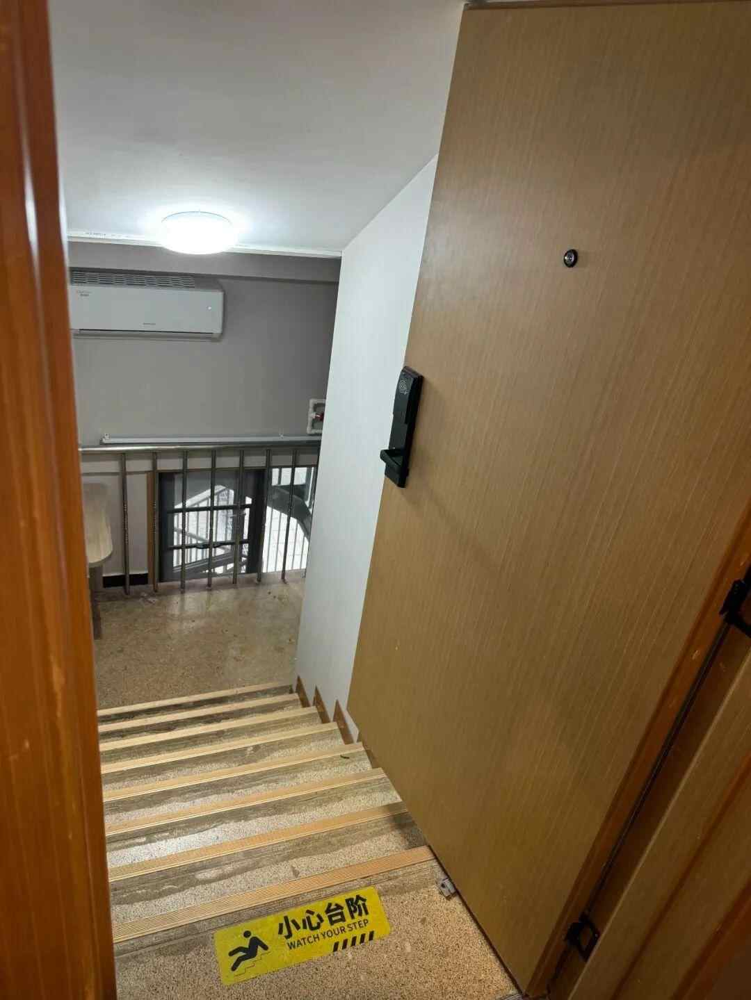 记者在现场看到,推开所谓“楼梯间房”的房门,的确需下行一段楼梯,之后便是一个摆放床铺的狭窄空间,三个房间上下并不连通,未形成“楼道”。目前三个房间均已清空,没有床铺,仅剩一台空调。