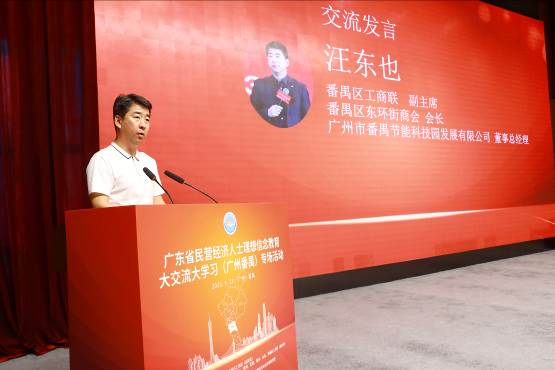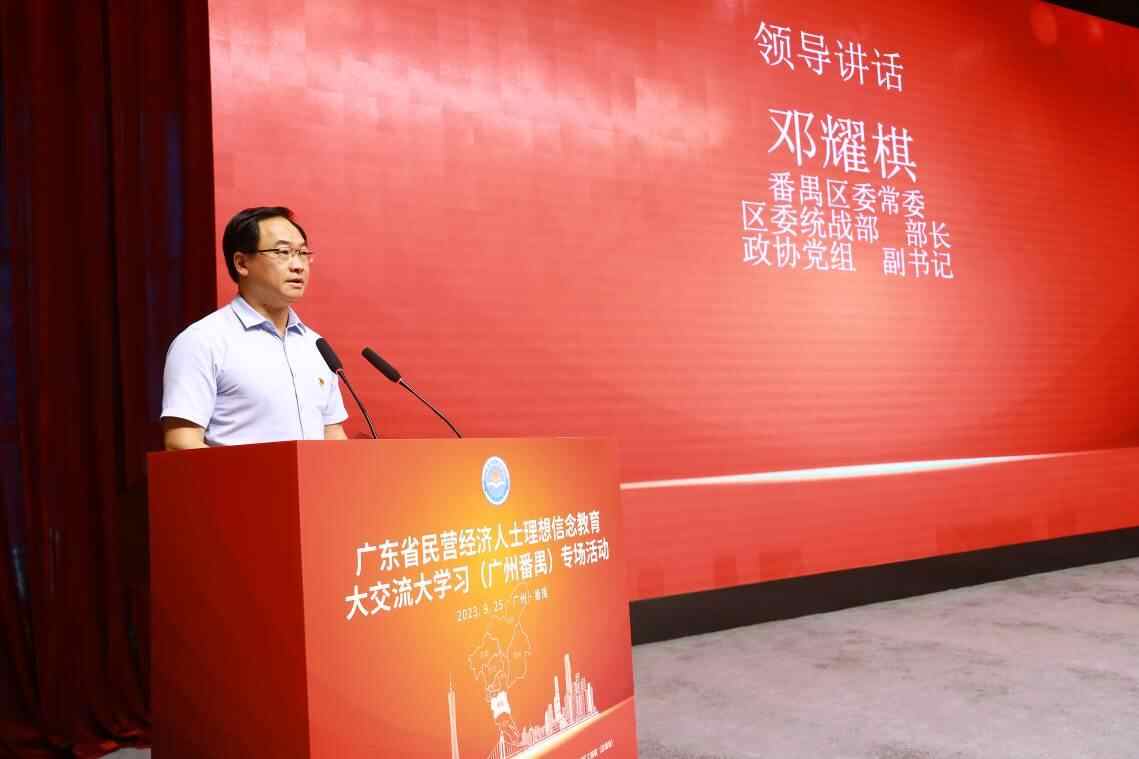 邓耀棋代表番禺区委、区政府向与会领导嘉宾表示欢迎与感谢,他表示,将发挥好番禺区非公经济教育点多、面广的优势,把商会、企业、园区的教育教学资源调动起来,统筹组织区非公理想信念教育基地同向发力,擦亮“新时代禺商培养工程”“禺商论坛”等教育品牌,开展多维度、全方位的理论政策宣讲活动,加强教学方式方法、平台载体的灵活创新,让广大民营经济人士学习热情更高,理想信念教育活动效果更好,促进民营经济高质量发展的劲头更足,推动理论学习成果向工作实践加速转化,锚定“排头兵、领头羊、火车头”的标高追求,为广州加快实现老城市新活力、“四个出新出彩”,推动广东在高质量发展方面发挥领头羊和火车头作用,作出番禺贡献。