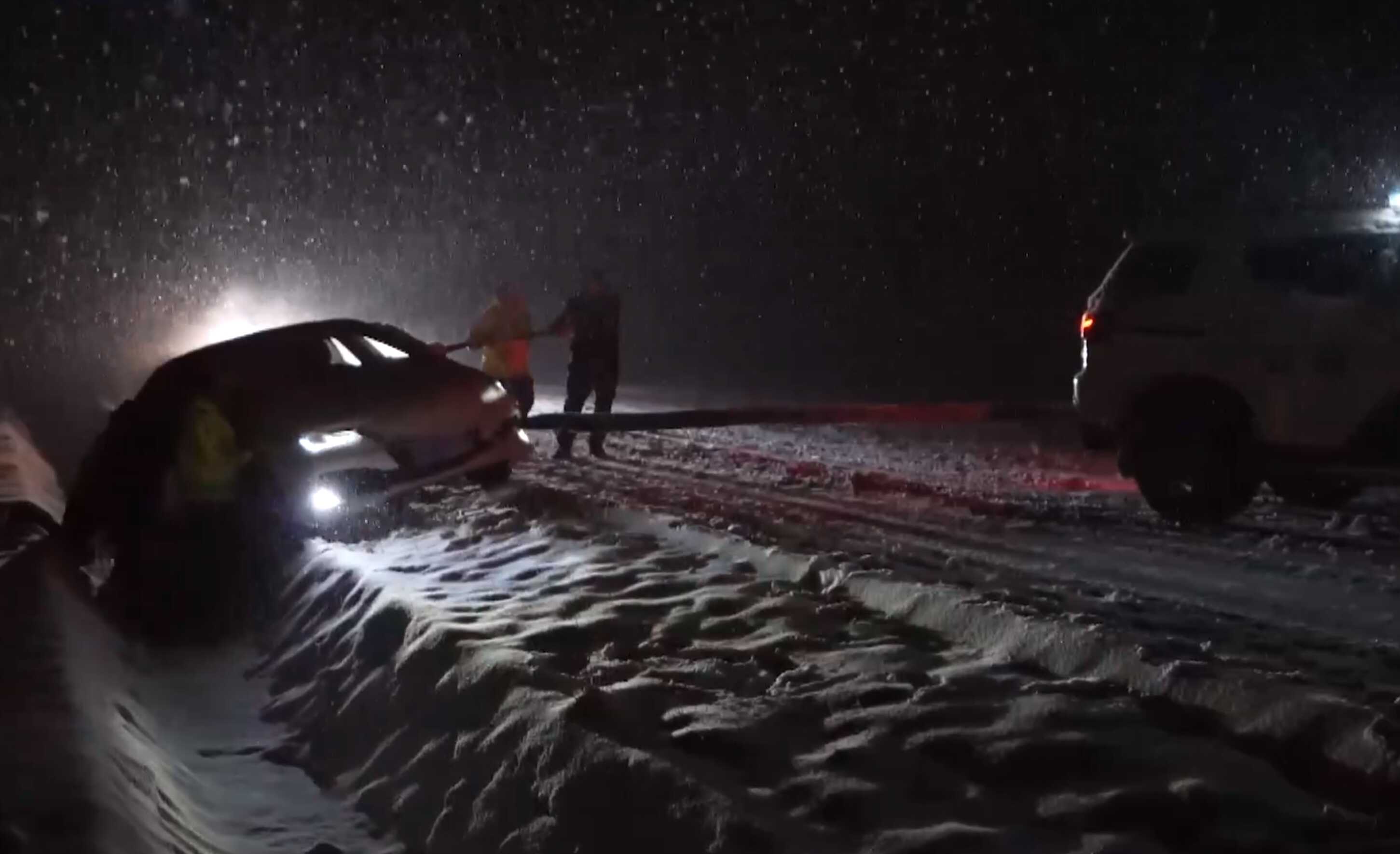 由于能见度低、道路湿滑,有游客的车辆不慎滑入路边排水沟,当地交警接警后立即赶往现场救援,帮助游客将车辆拖拽出排水沟并送至山下平缓地带。