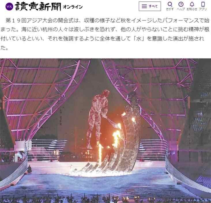 日本《读卖新闻》网站的报道聚焦杭州亚运会开幕式所采用的数字礼花低碳环保技术,称开幕式以收获等充满秋天符号的表演拉开帷幕,演出以水为主题,展现出杭州人不惧风浪敢为天下先的拼搏精神。