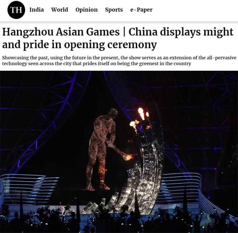 《印度教徒报》网站报道,亚运会开幕式展示了中国的实力,展现了中国的自豪感。过去的荣耀与未来的力量汇聚在当下,开幕式盛大的表演成为中国展现时代风貌的窗口。