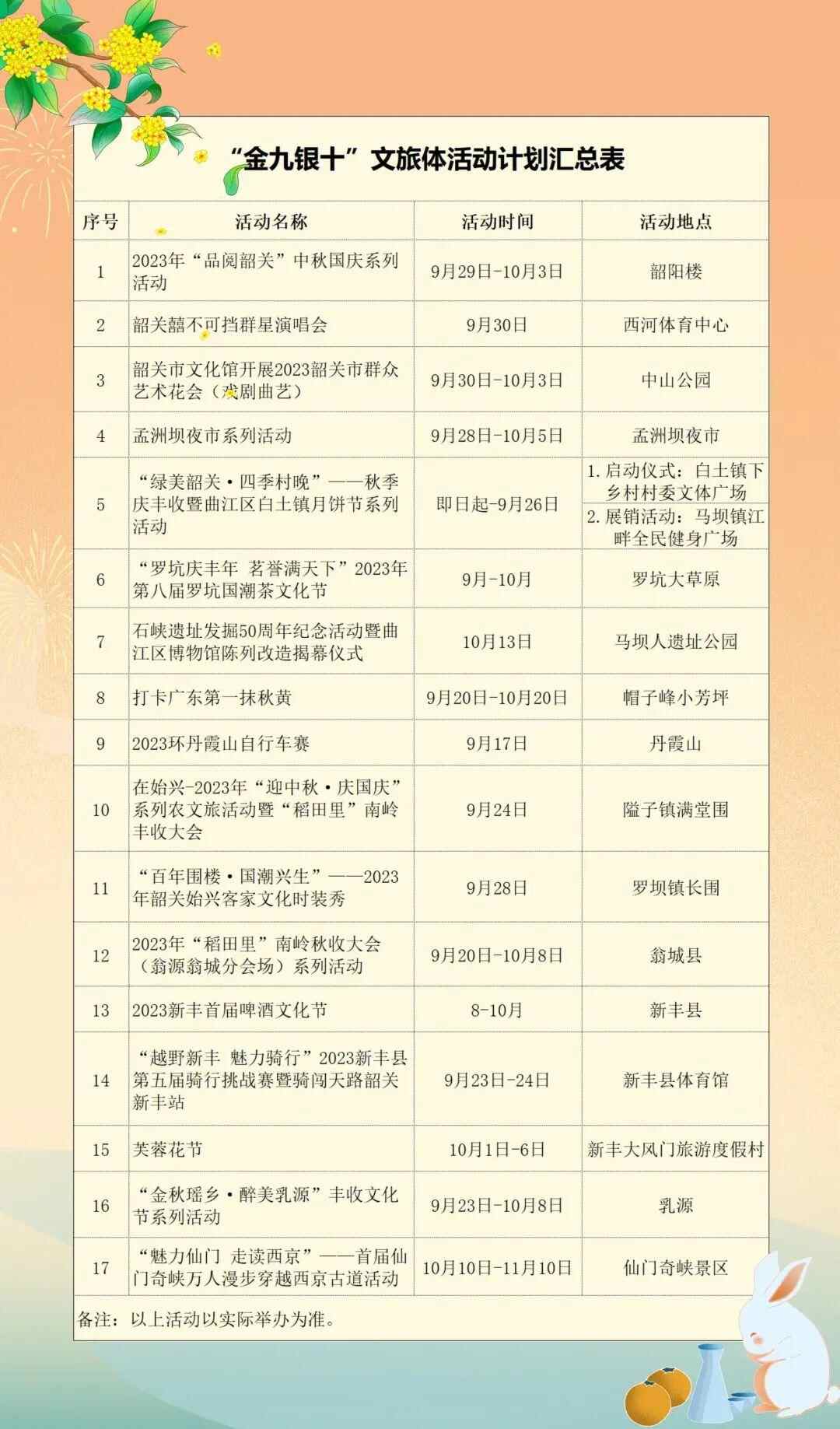 9月26日记者从韶关市文化广电旅游体育局获悉,为迎接即将到来的中秋和国庆8天假期,韶关市推出10条金秋文旅精品线路、114项文旅体活动和近50项文旅优惠措施,丰富假日期间文旅产品供给,满足市民游客多样化需求,进一步激发韶关文旅体市场活力,促进文旅体产业链融合发展。