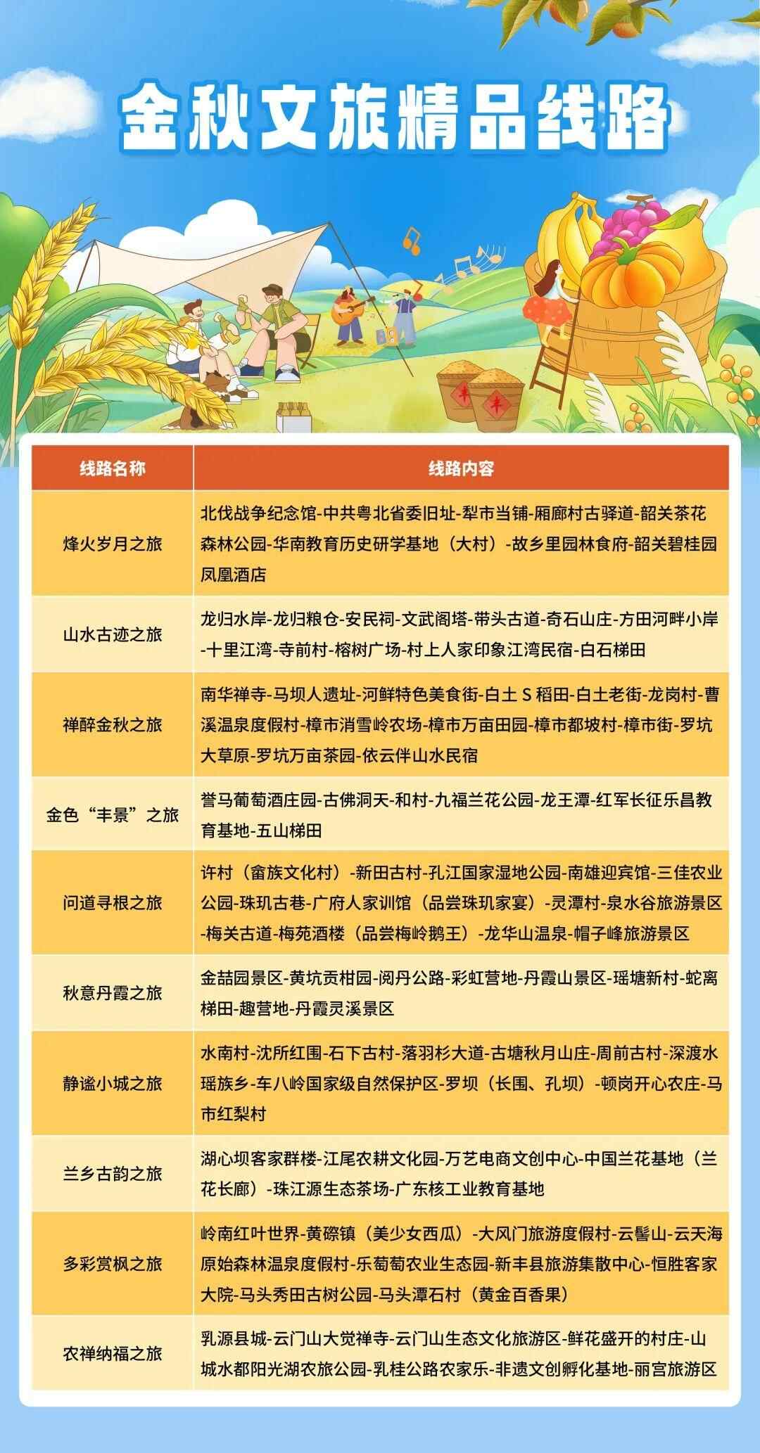 10条金秋文旅精品线路,涵盖烽火岁月之旅、山水古迹之旅、秋意丹霞之旅等,引领游客们于橙黄橘绿、秋意渐浓的时节,在韶关的山水、田园、城市之间,赏秋景、品秋韵、享秋实,在倏忽而过的时光中感受每时每刻的精彩。