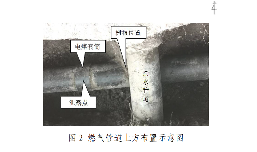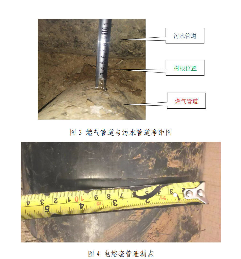 根据查阅资料、实地调查、现场勘验、物证分析,经过专家评估论证,排除了人为破坏、雷电、地质灾害等原因,认定发生泄漏的燃气管道公称直径200mm,管道壁厚11.3mm不符合《燃气用埋地聚乙烯管材》的要求,电熔套筒壁厚11.3mm不符合《燃气用埋地聚乙烯管件》的要求;燃气管道与上方的污水管道垂直间距不达标,经现场测量污水管道与下方燃气管道的垂直间距60mm;燃气管道受上方多年生长的树根(平均直径60mm)及污水管道挤压,引起燃气管道局部下沉,造成临近挤压点的电熔套筒中间部位破裂,导致天然气泄漏。