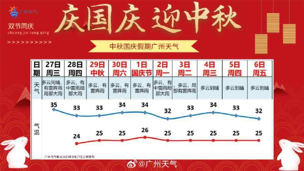 展望9月28日至10月6日,广州市区日最高气温介于32℃~34℃,日最低气温介于24℃~26℃。