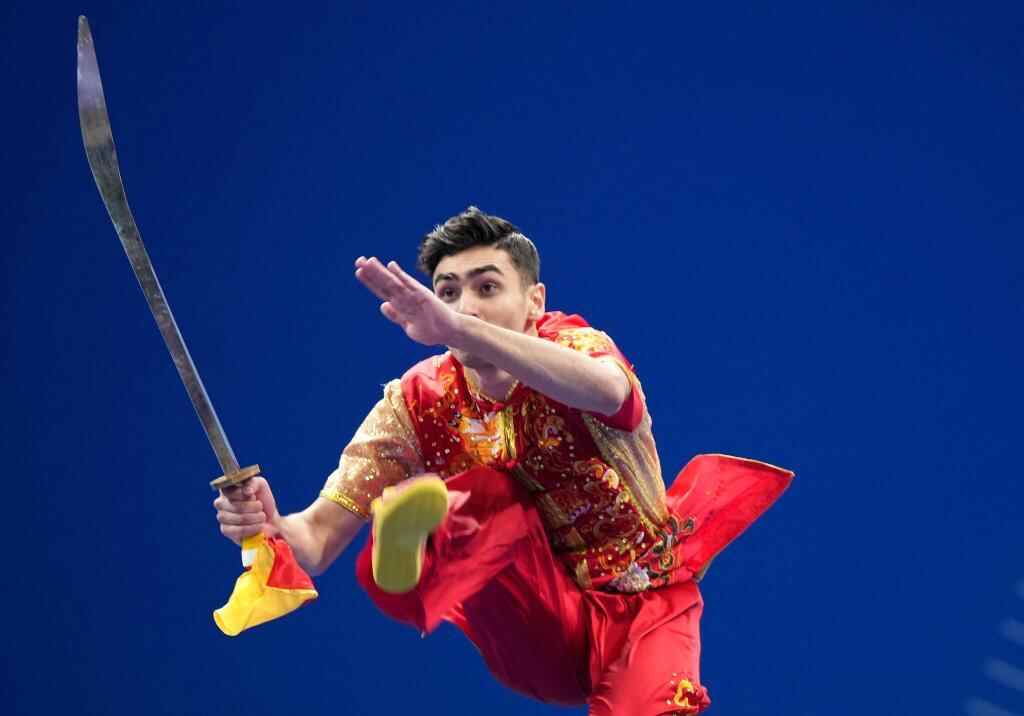 9月27日,伊朗选手侯赛因·盖卜莱纳迈·穆加达姆在刀术比赛中。当日,杭州亚运会武术男子刀术棍术全能决赛在杭州萧山瓜沥文化体育中心举行。新华社记者 李一博 摄