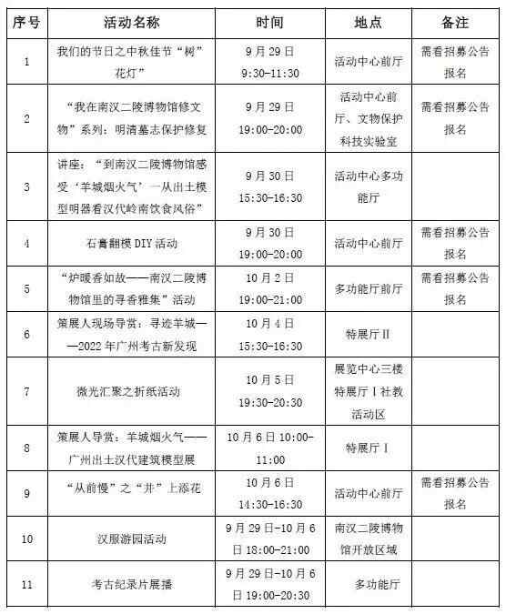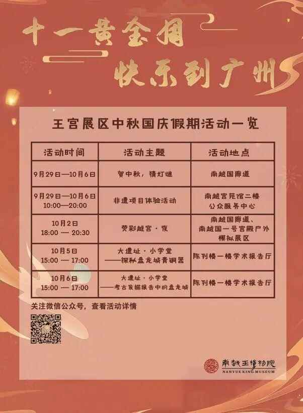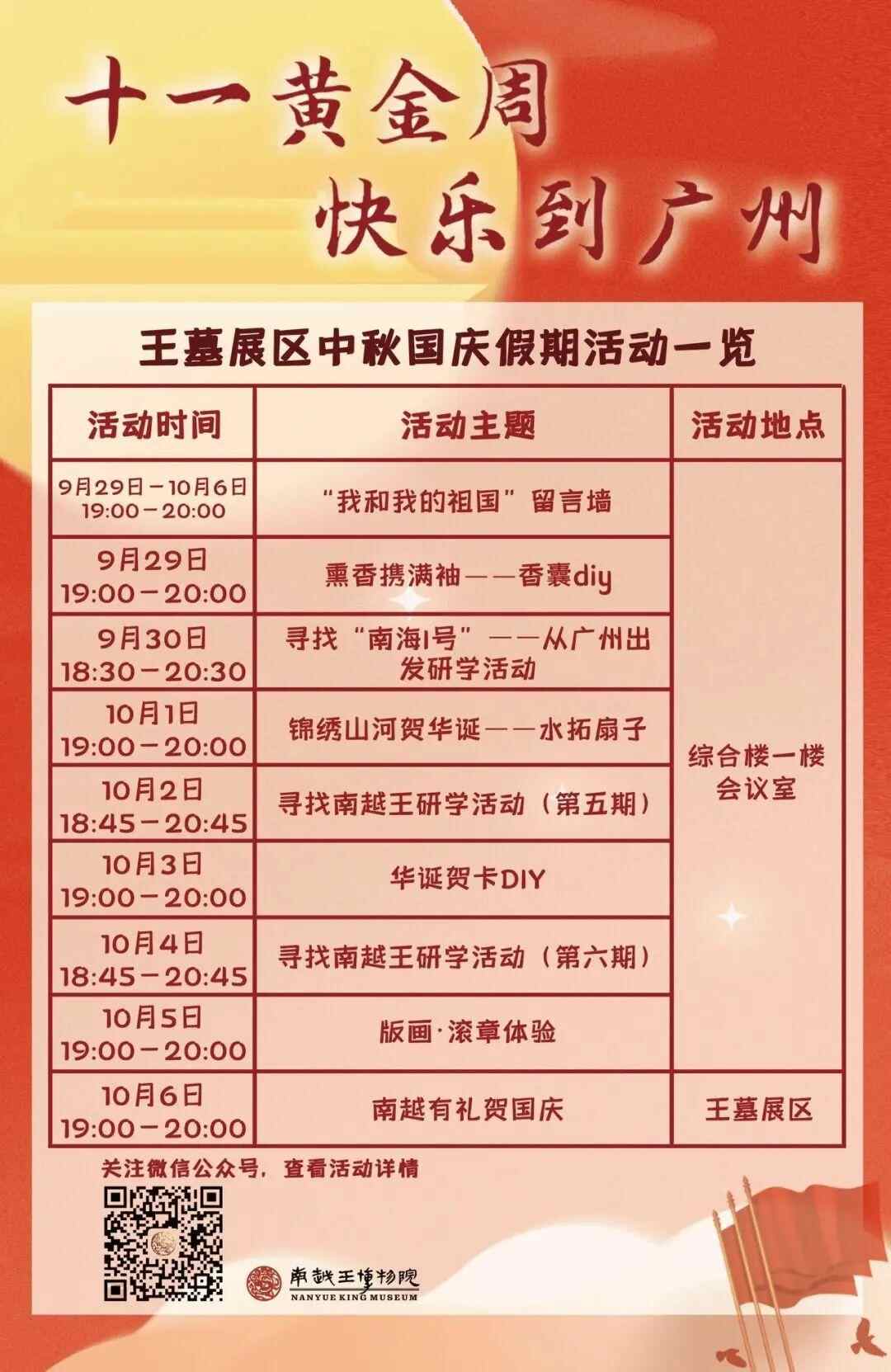 南越王博物院在王宫展区和王墓展区分别准备了丰富多彩的节庆体验活动,多场活动开设在夜间,不仅如此,南越王博物院还向观众推出王墓展区国庆期间门票全票八折即8元,半票5元的优惠。