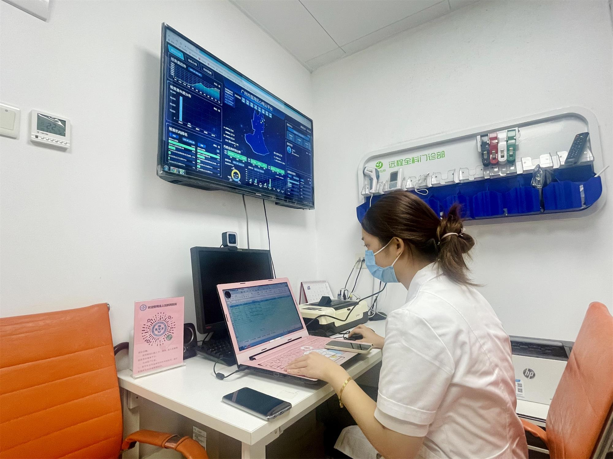 这个区域慢病中心,面积虽小但功能实用,犹如一个“医疗版的110指挥台”:墙上的控制屏,跳动的数字实时显示着:当前正在启用远程诊疗平台的,共有2家诊断中心,17位诊断医生;远程诊疗控制室中,有专人监控实时响应远程诊疗需求;24小时动态心电、动态血压等检查,设有专门的监测屏幕,当数值出现异常报警,24小时当值的医生可立即联系患者或其家属。