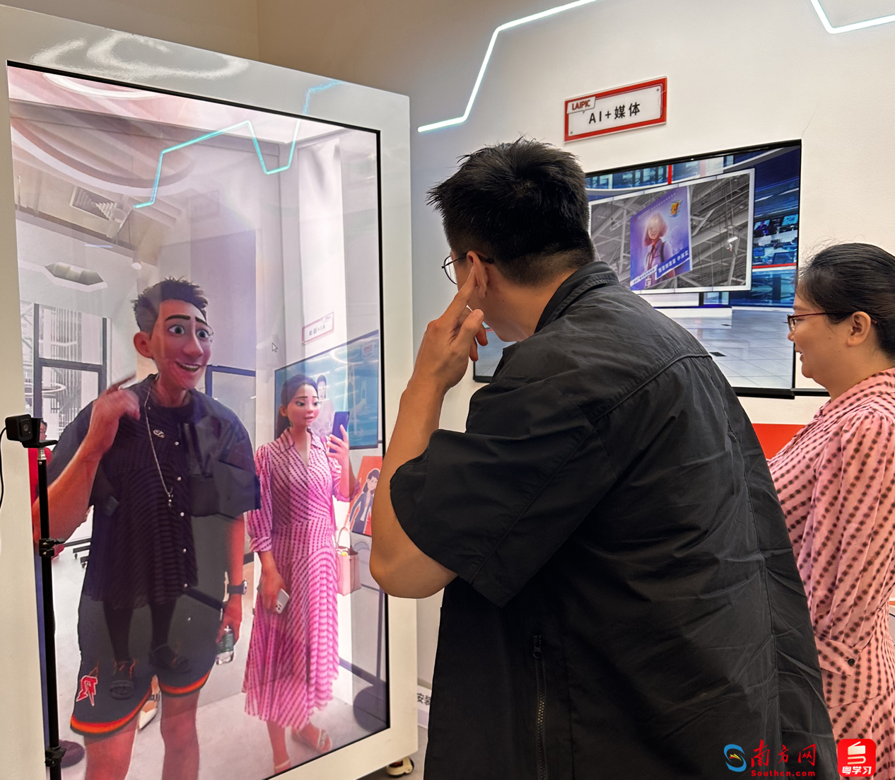 记者来到深圳市前海手绘科技文化有限公司(以下简称“来画”)展厅,一种现实生活与虚拟空间冲撞融合的科技感扑面而来。只要站在摄像头前,人工智能设备就会根据你的五官,快速塑造出你的数字人形象,激起调研团的兴趣,大家纷纷上前体验。