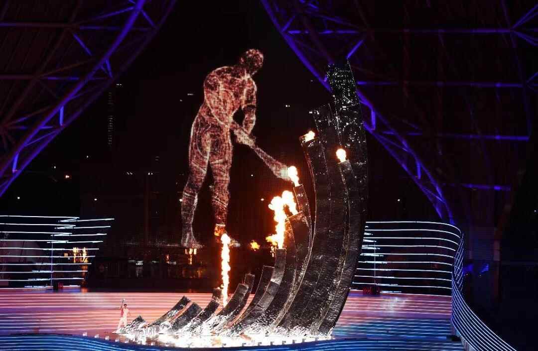 开幕式上,象征着超过1亿名“数字火炬手”的金色数字人手持火炬,跑过会场,与主火炬手一起点燃主火炬塔。此次数字人点火仪式由广州动天创意动作捕捉研究中心担任捕捉任务,该数字人点火仪式利用亚毫米级的光学动作捕捉设备的优势精准抓取专业运动员的各项动作数据,并将其完美匹配在数字人身上。