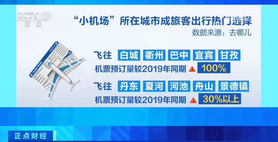 业内人士告诉记者,今年中秋国庆假期民航出行呈现干线火爆,支线热门的态势,一些所处地理位置较为偏远的机场成为今年旅客选择的高性价比目的地。数据显示,假期期间“小机场”所在城市平均机票支付价格为850元/张,飞往白城、衢州、巴中、宜宾、甘孜的机票预订量较2019年同期增长100%,飞往丹东、夏河、河池、舟山、景德镇的机票预订量较2019年同期增长30%以上。