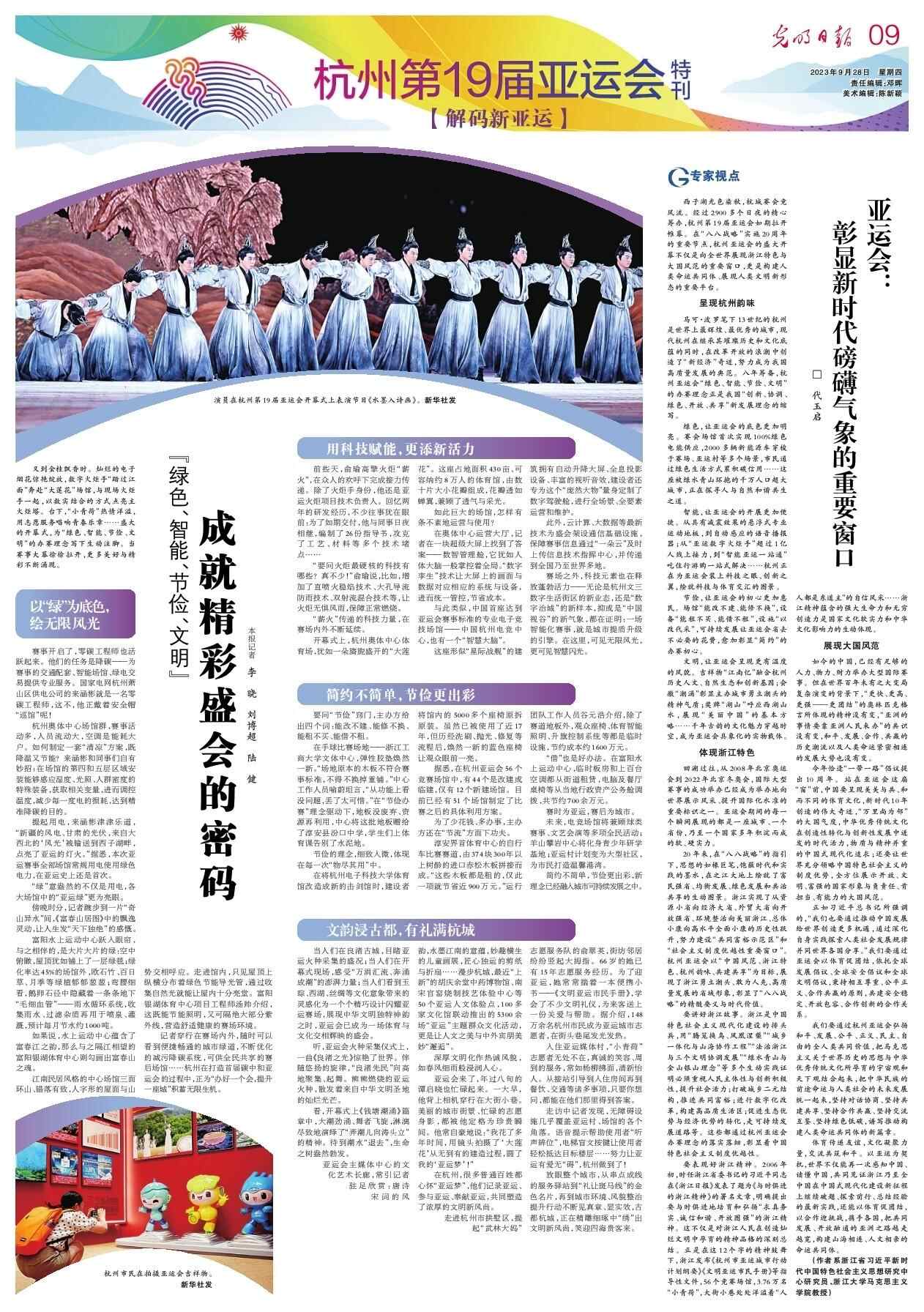 当人们在良渚古城,目睹亚运火种采集的盛况;当人们在开幕式现场,感受“万涓汇流、奔涌成潮”的澎湃力量;当人们看到玉琮、西湖、丝绸等文化意象带来的灵感化为一个个精巧设计闪耀亚运赛场,展现中华文明独特神韵之时,亚运会已成为一场体育与文化交相辉映的盛会。