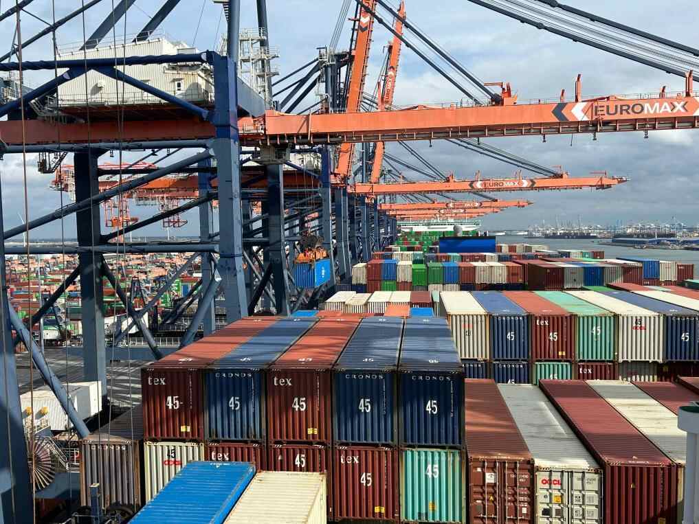 9月20日,“中远海运室女座”号集装箱船停靠在荷兰鹿特丹港作业。新华社发