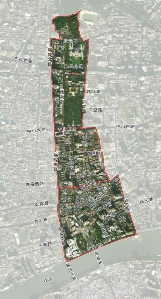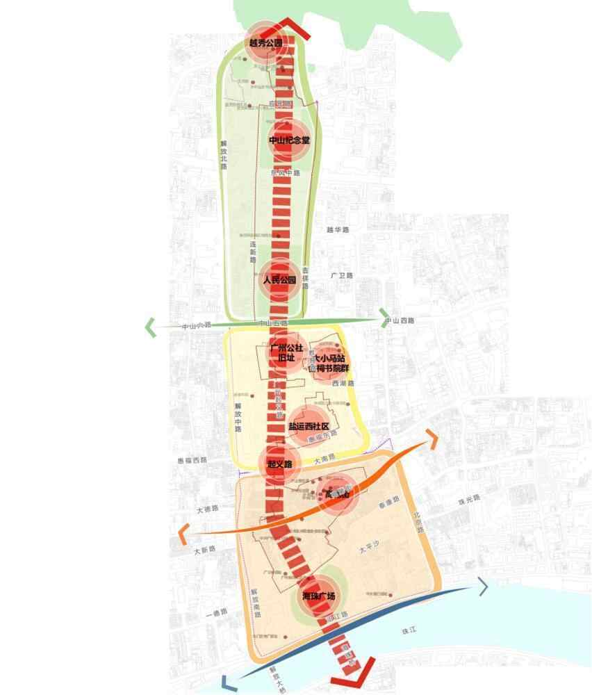 北起越秀山,南衔珠江。广州市传统中轴线(近代)历史文化街区是广州历史城区的重要轴线,其建设和发展体现了广州从古代城市到近代城市的转变。