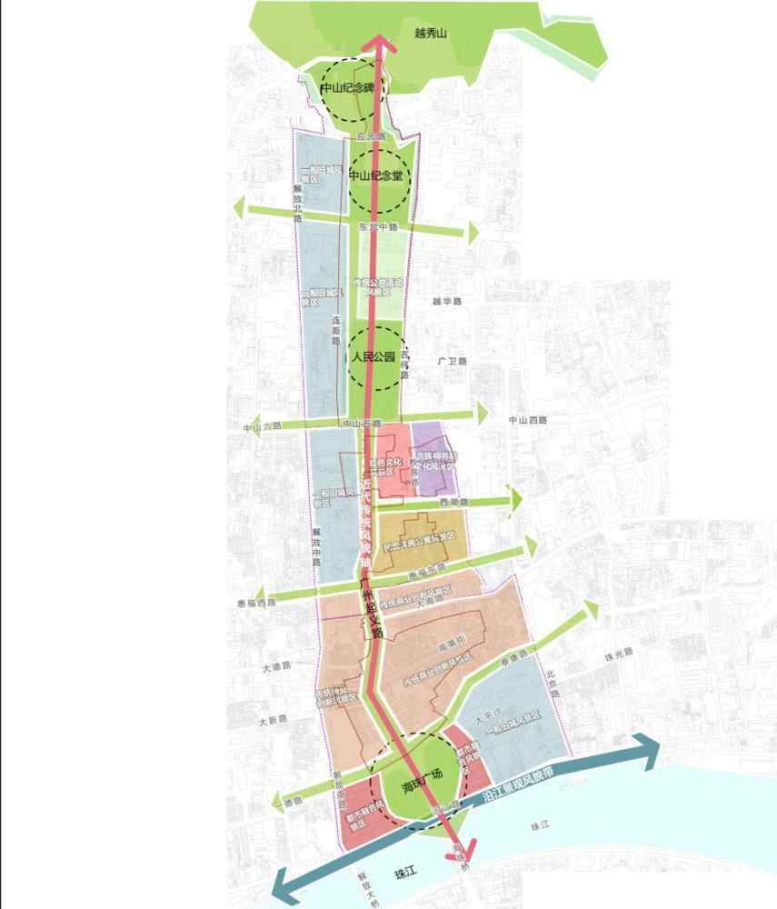 《规划》对街区内的产业进行分区。其中,传统中轴线(近代)北段,包括越秀山、中山纪念堂、人民公园,打造人文休闲旅游及行政办公产业片区,主导产业为文体娱乐、商务服务业。