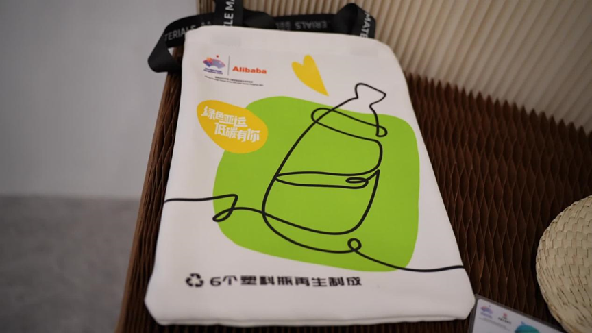 在无废生活馆,三大类礼品都很受欢迎。第一类是亚运元素满满的特许商品,比如大家都喜欢的“三小只”吉祥物玩偶,以及各类徽章。第二类是亚运村内各个赞助商提供的礼品,比如,一杯香浓的咖啡、一块精美的鼠标垫、一个精致的网球包等。值得一提的是,这些礼品都是有着碳减排的环保商品。第三类则是由阿里集团提供的回收再利用制品,工作人员在亚运村内回收塑料瓶、纸盒等垃圾,经过再加工,变成了实用的蒲扇、袋子、衣物等等。