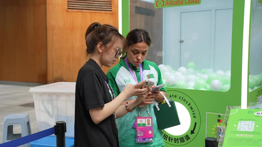 “Wish me luck(祝我好运)!”在无废生活馆门口的扭蛋机边,一位吉尔吉斯斯坦运动员正准备用积分抽一个扭蛋盲盒,试一试自己的运气。咔嗒一声,扭蛋到手,打开一看,正是他想要的礼物。开盲盒的快乐,确实不一般。