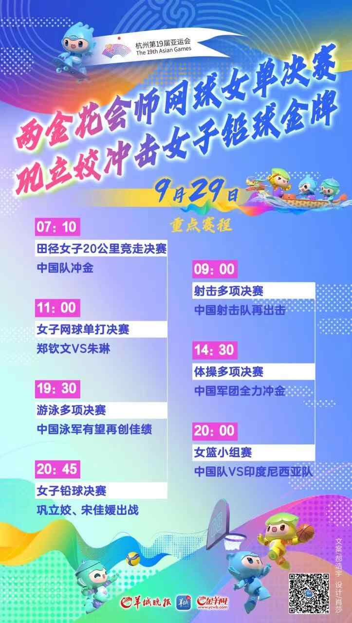 9月29日是杭州亚运会开幕后的第六个正式比赛日。当天将产生33块金牌,其中游泳、体操、击剑等项目将决出最后几枚金牌的归属,同天田径项目将密集开赛,中国田径队的表现值得关注。此外最值得关注的项目当属网球,29日将产生女单和男双两枚金牌,中国金花郑钦文、朱琳和王欣瑜的表现成为一大看点。