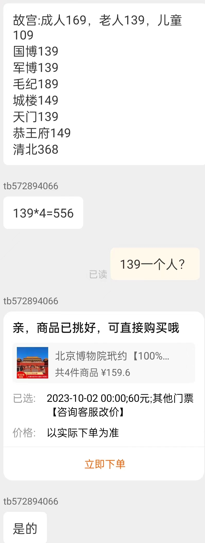 以其中一位商家为例,客服人员表示代购故宫成人票价为169元,国博票价139元,军博票价139元,毛主席纪念堂票价为189元,清华大学与北京大学包票为368元。在购买流程上,商家要求用户先下单后,再经商家后台改价后才能付款。