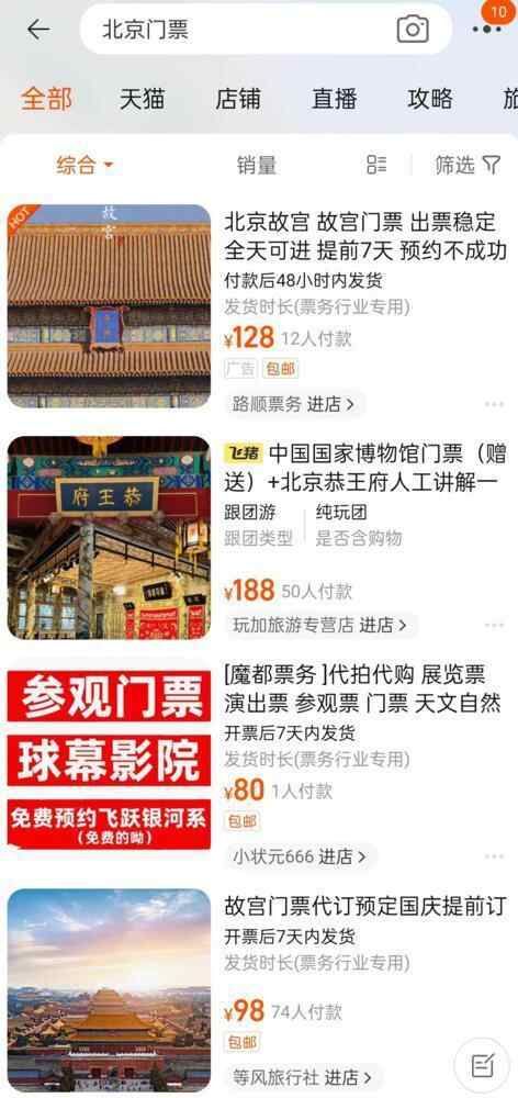 记者以“北京门票”为关键词在电商平台进行搜索,包括故宫博物院、中国国家博物馆、北京恭王府、中国人民革命军事博物馆等北京热门景点门票都有商家提供代购服务,并承诺“抢不到票包退”,而门票价格远高于官方平台售卖价格。