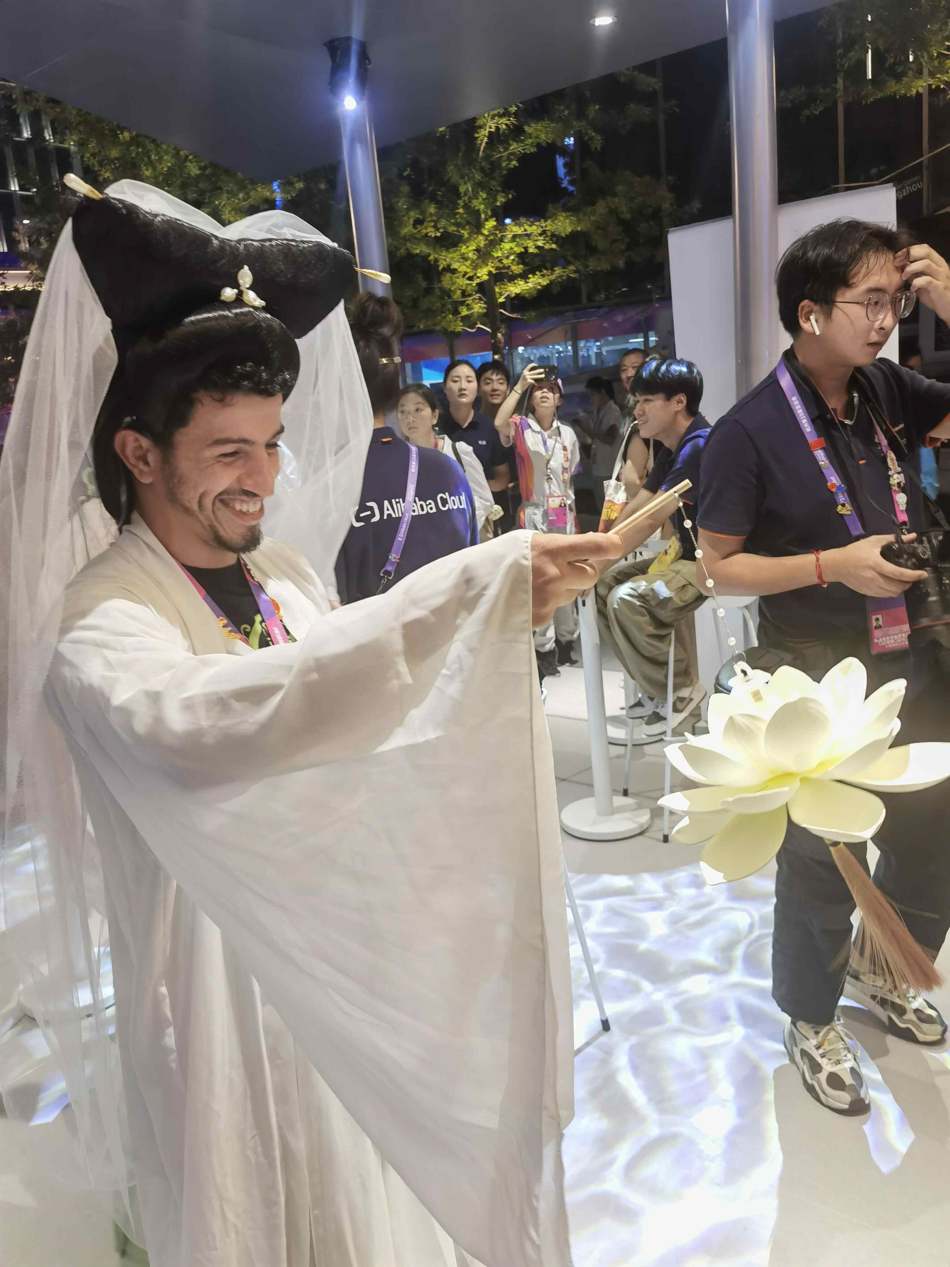 现场,一位穿着白娘子服装、头戴发髻、手拎莲花灯的也门运动员引来不少人的围观。另一名来自巴基斯坦的随队官员则穿着汉服,不少人纷纷与之合影。他说:“在这里,我知道了中秋节是一个和家人团聚的重要日子。这里的氛围很好,我也体验了一些中国传统文化,感受到中国人的友善。”今晚,他听到最多的一句中文是“中秋快乐”,于是他也现学现用,微笑着祝大家“中秋快乐!”