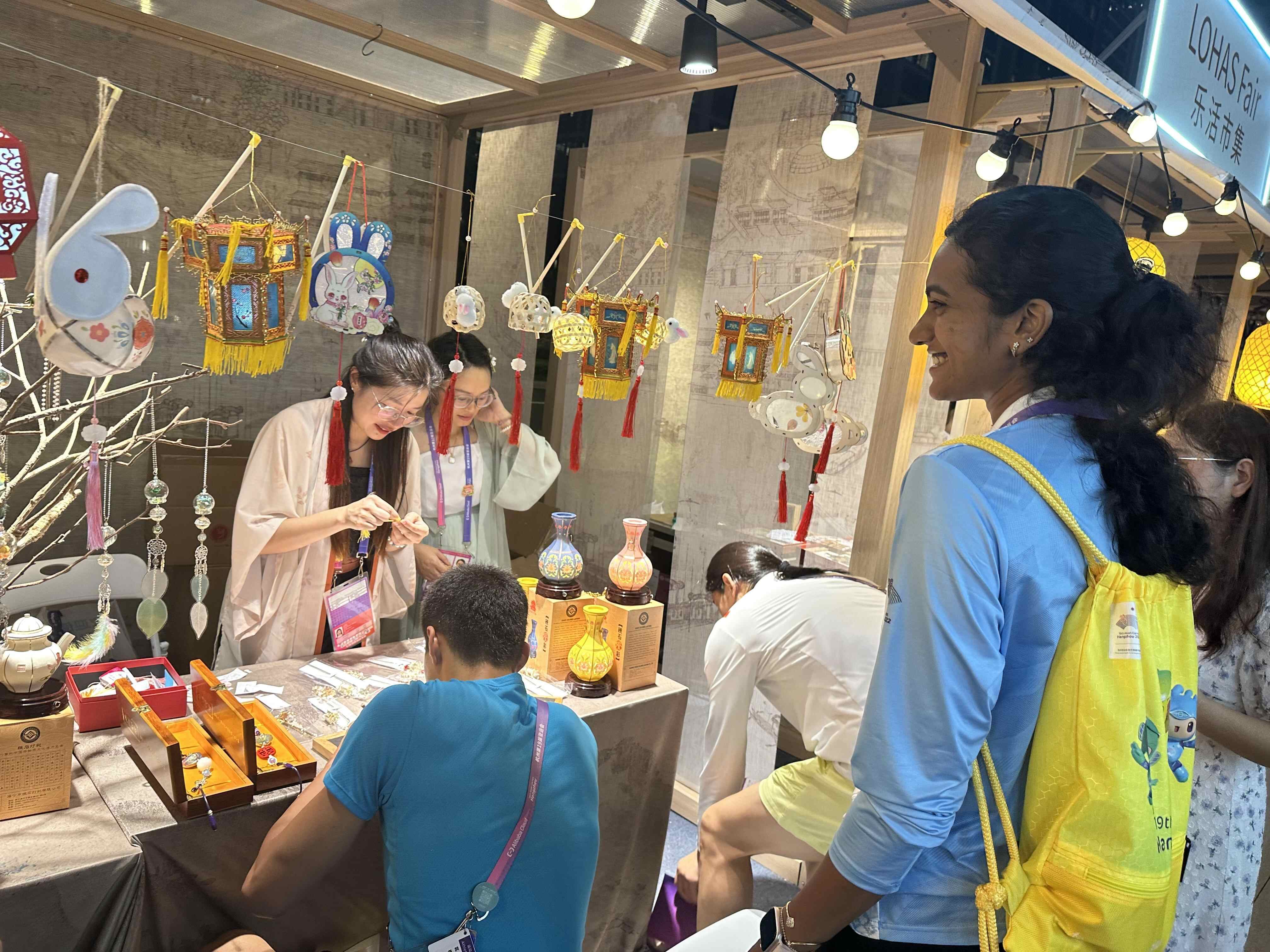 在中秋节当晚的乐活市集,还特别推出了“唐风宋韵”汉服体验。运动员们换上汉服、提上灯笼,在灯笼墙下拍照打卡,可以“穿越古今”体验踢毽、投壶、蹴鞠等传统体育项目,还可以体验编花篮、演皮影戏,用南宋官窑瓷土做“瓷月饼”等等。