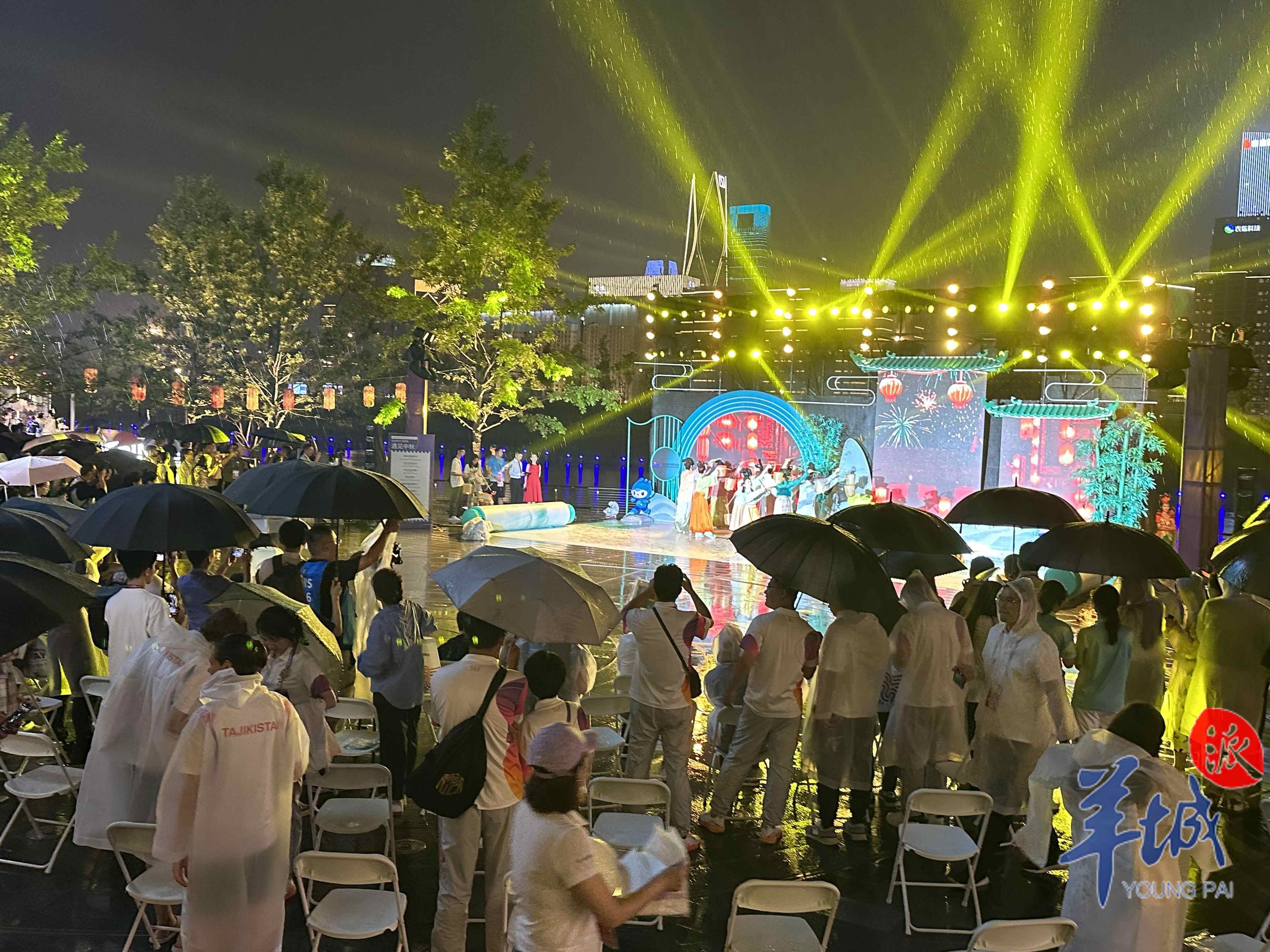 可惜天公不作美,在中秋之夜,原本晴朗的天气开始下起小雨。在晚上七点半,一场主题为“遇见中秋”的专场演出如期上演,不少运动员和观众,或打起雨伞、或穿起雨衣、或就站在细雨中欣赏表演。