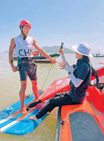 9月27日,徐莉佳(右)在宁波象山亚帆中心采访中国帆船帆板队选手。