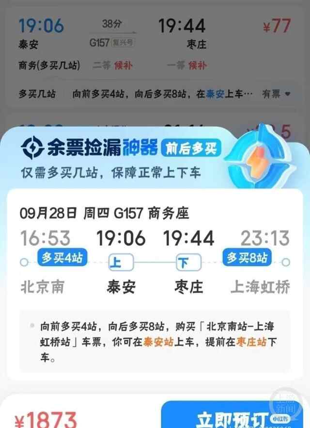 还有一名网友本打算28日从山东泰安到枣庄,二等座价格为77元,但由于无票,智行APP建议他“向前多买4站,向后多买8站,购买北京南京-上海虹桥站车票,你可以在泰安站上车,提前在枣庄站下车。”车票价格也从77元飙升至1873元。对于这样的建议,围观网友们纷纷表示不能理解:“能不能靠谱点?”