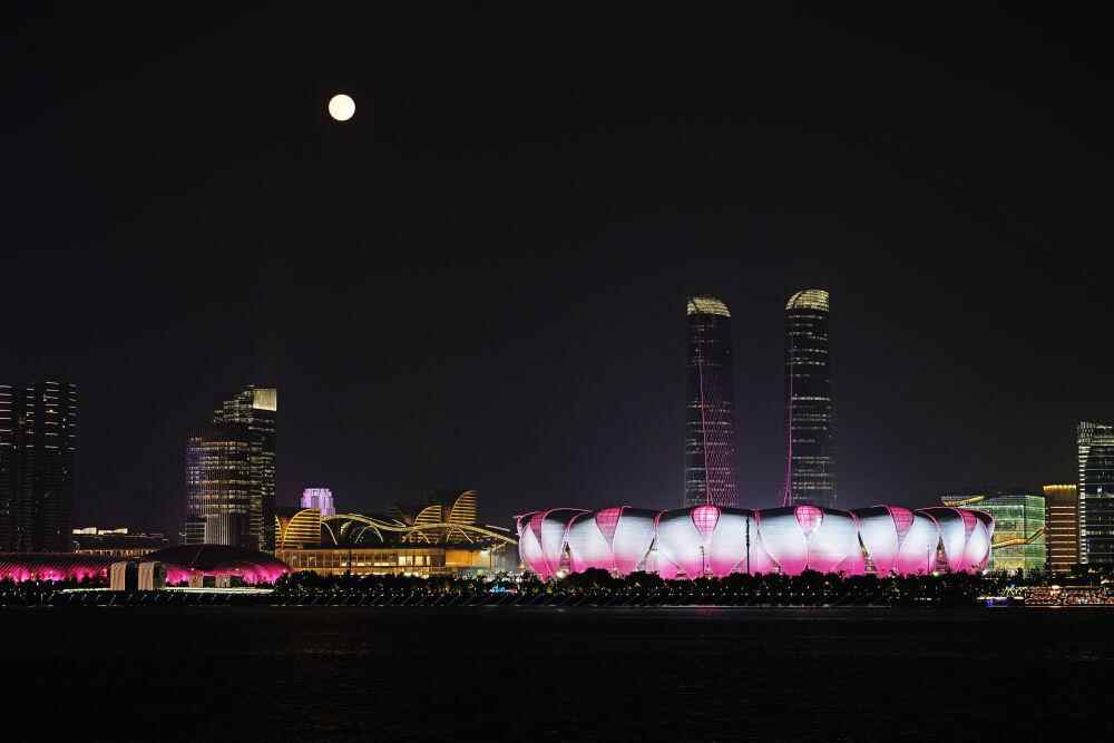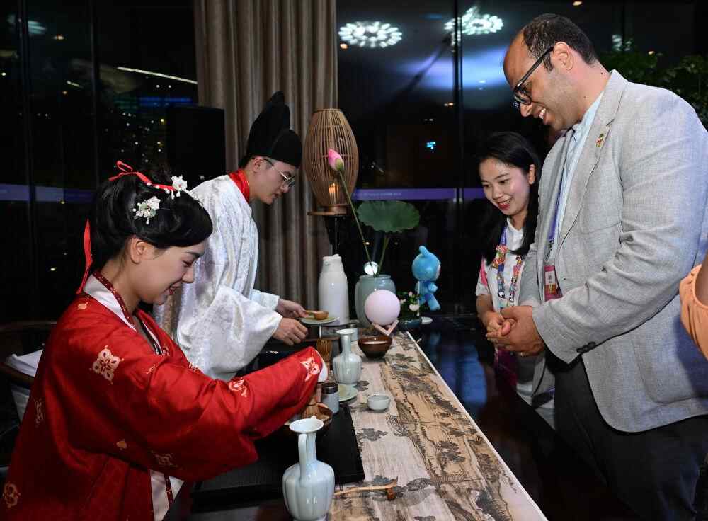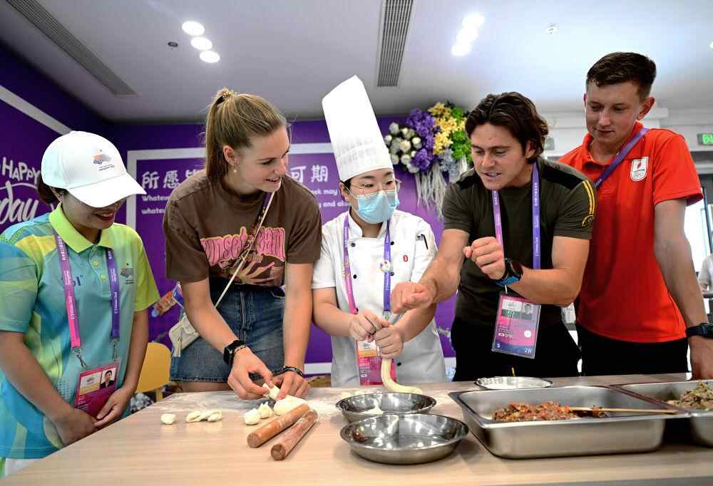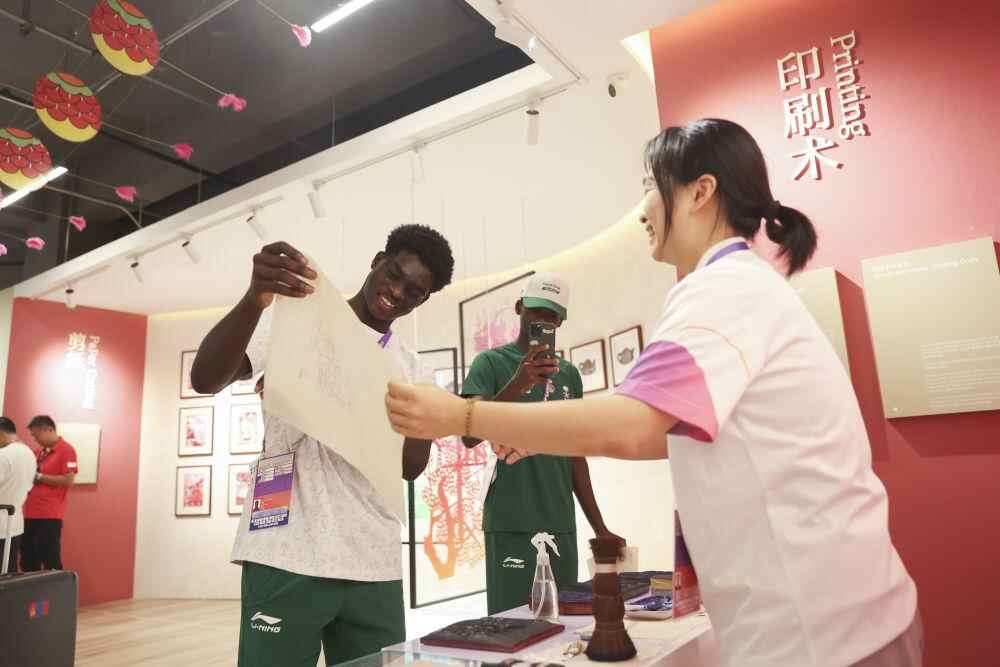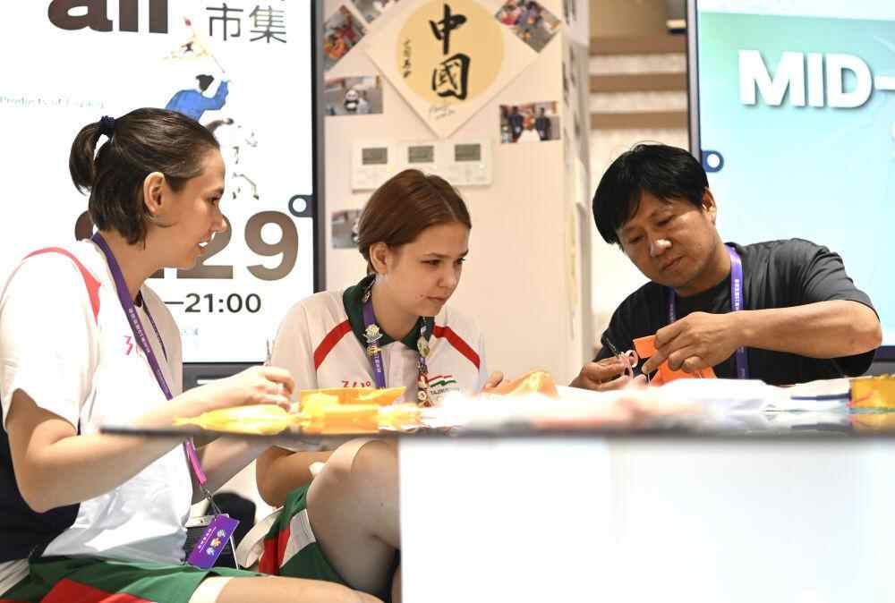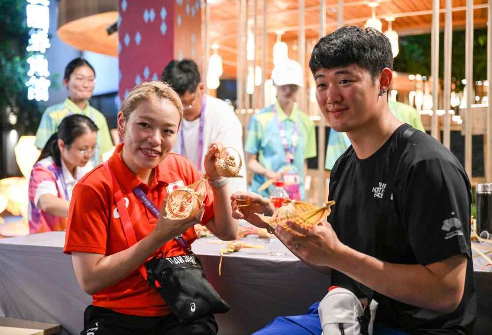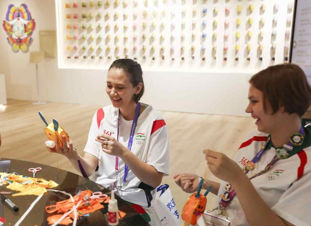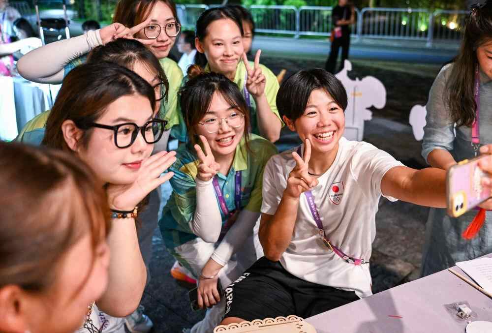 9月25日,一名日本运动员(右)在淳安赛区传统工艺体验坊和志愿者合影。