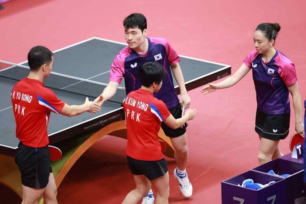 9月28日,韩国组合张禹珍/田志希与朝鲜组合咸柔成/金金鹰在乒乓球混合双打八分之一决赛后握手致意。