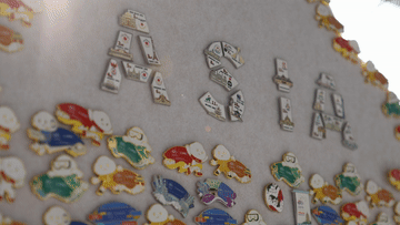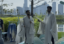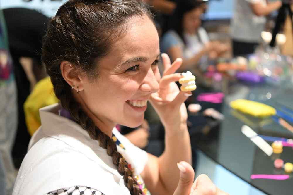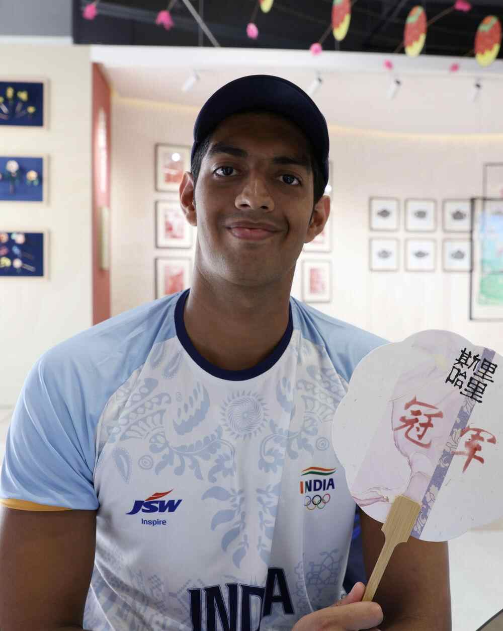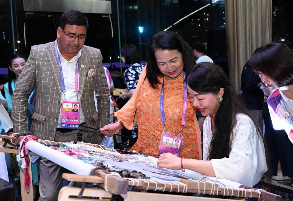 9月29日,马尔代夫羽毛球运动员穆罕默德·阿杰凡·拉希德(左)在亚运村乐活集市与工作人员合影留念。