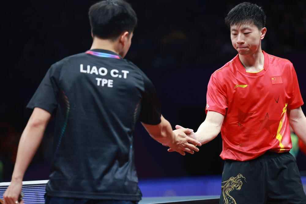 9月25日,中国队选手马龙(右)在乒乓球男子团体半决赛后与中国台北队选手廖振珽握手致意。
